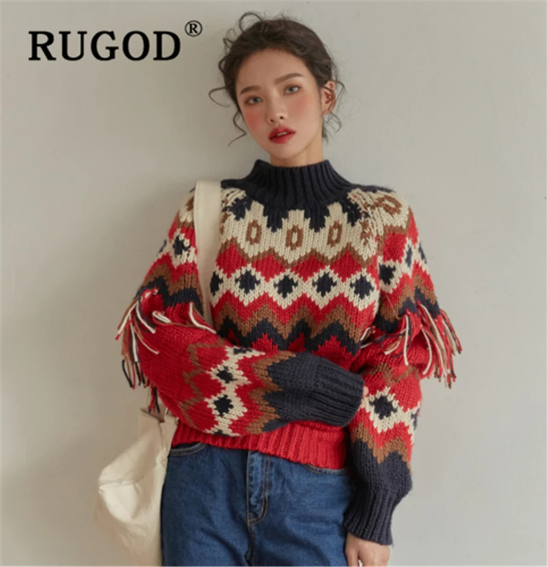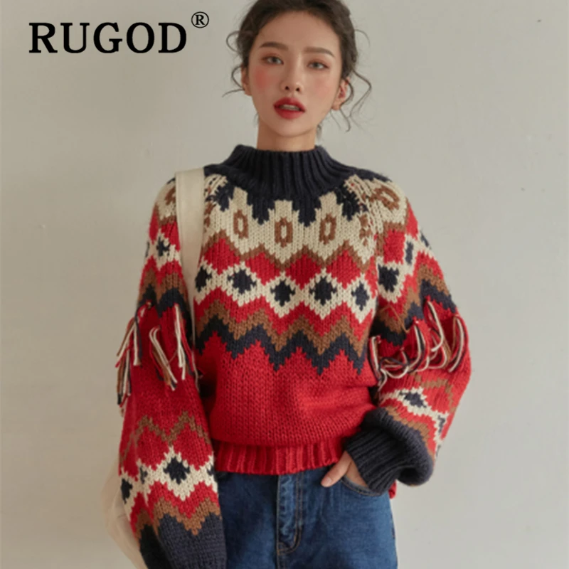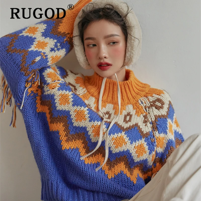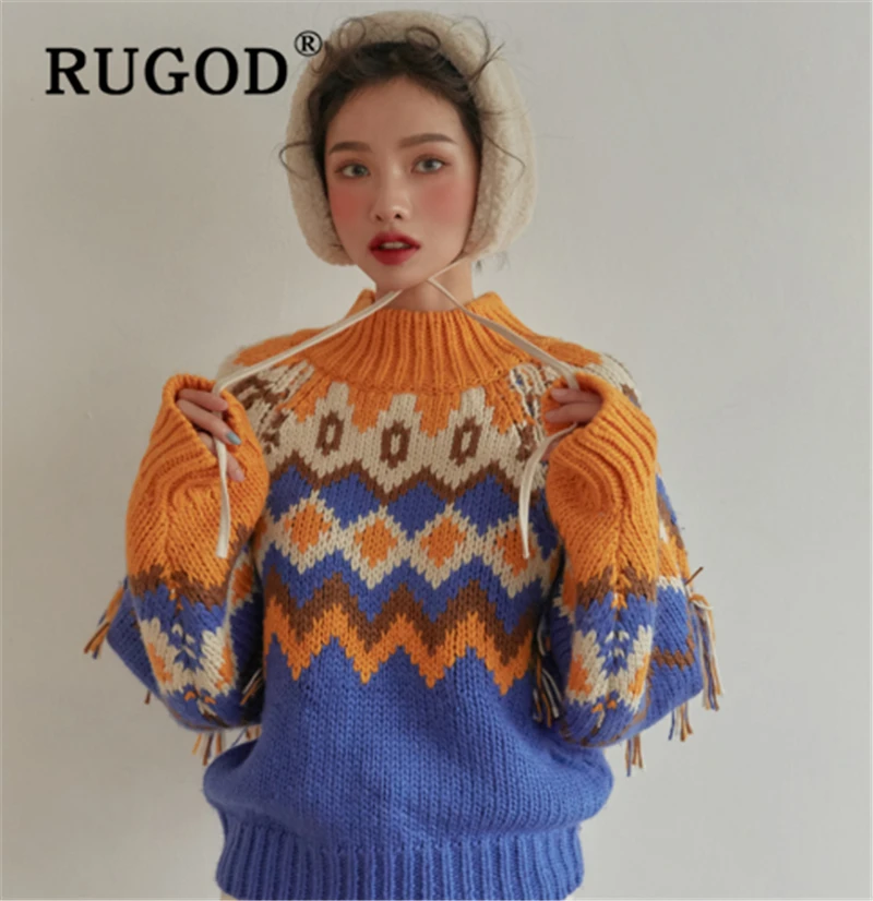 New RUGOD Chic knitted patchwork sweater women Korean lantern sleeve folk-custom pullovers female Fashi